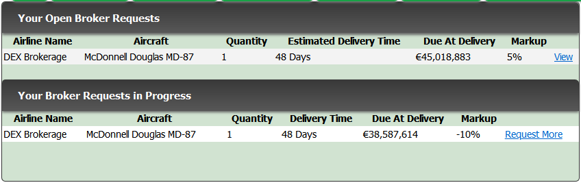 Here you can see your brokerage requests that have been fulfilled or are waiting. The delivery time shows three different numbers, depending on the status of the aircraft. If the request has not been accepted yet, it shows the normal delivery time of the aircraft model. If your request has been accepted, it shows the remaining time before the aircraft is available to your airline. If the aircraft has been delivered but is awaiting your purchase, it shows the remaining amount of time until the aircraft can be sold publicly by the broker.