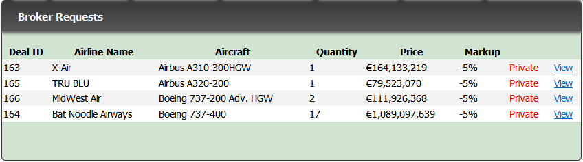Click here to see the requests for aircraft brokerage that haven't been fulfilled yet. Public requests will be visible to all players, while private requests will be visible to the airline requested only. Official brokers are usually the ones to accept requests.