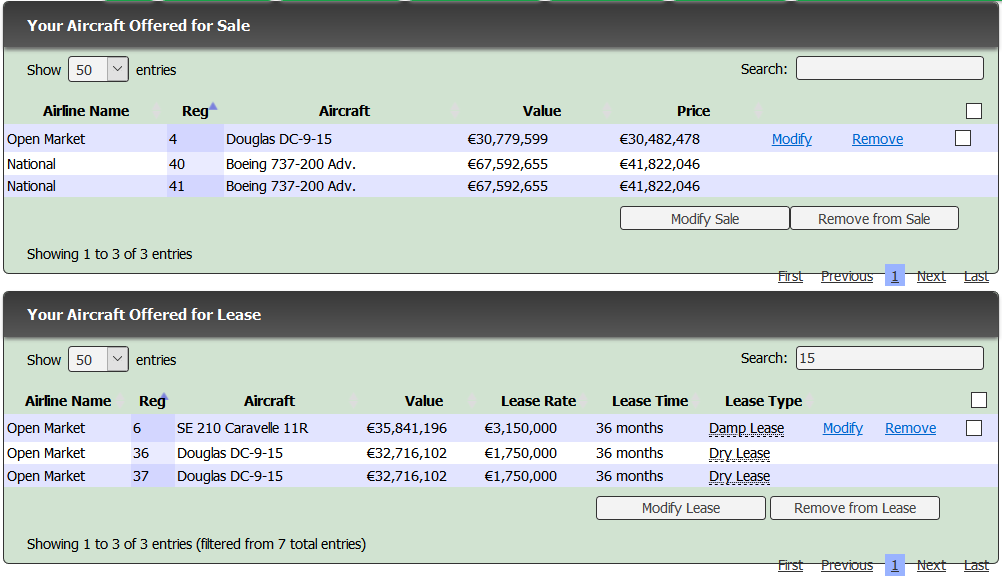 If you have offered any aircraft for sale or lease, then you can see them all here. It is possible to edit the offers, or retract them from the market altogether. By selecting the checkboxes it is possible to edit several aircraft at once.