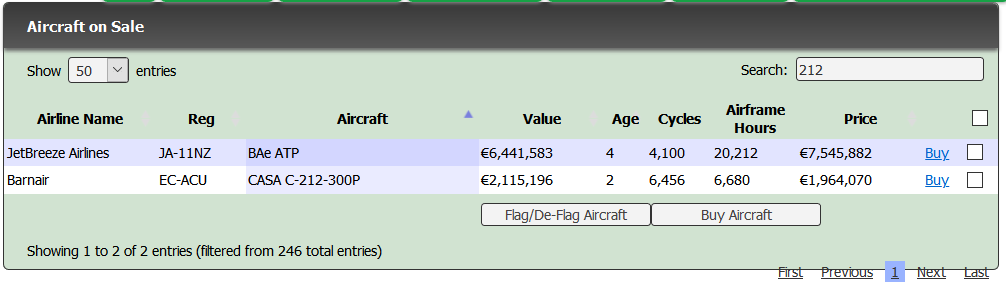 There is a list of all aircraft available for public sale, but also including aircraft that are on private sale for you only. You can sort the list by clicking on the headers and search anything by writing in the searchbox.