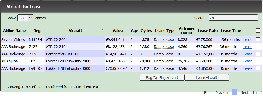 There is a list of all aircraft available for public lease, but also including aircraft that are on private lease for you only. You can sort the list by clicking on the headers and search anything by writing in the searchbox.