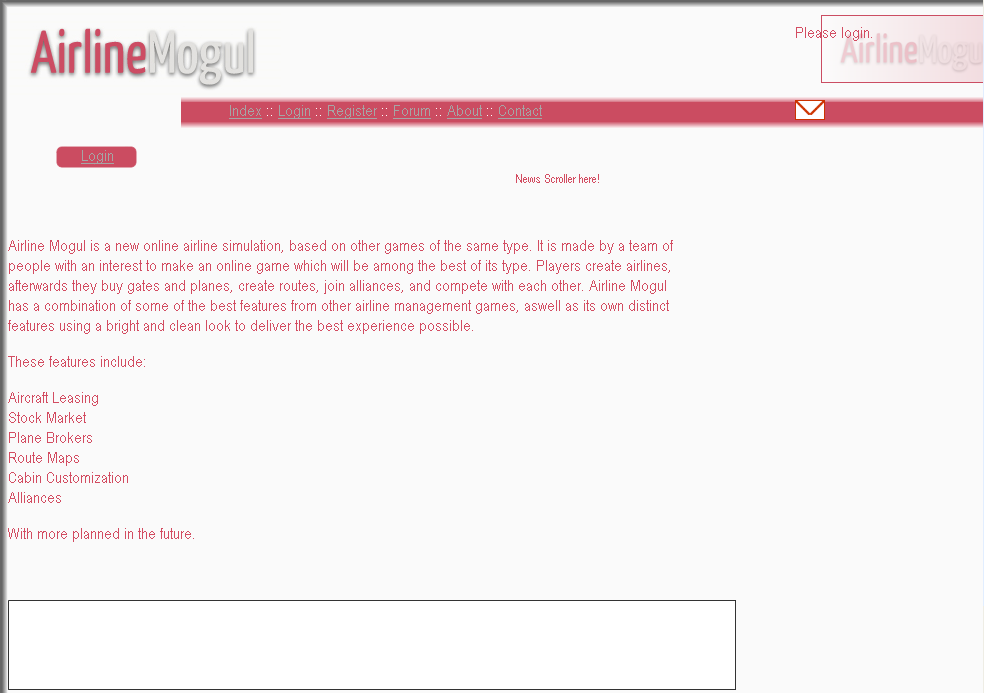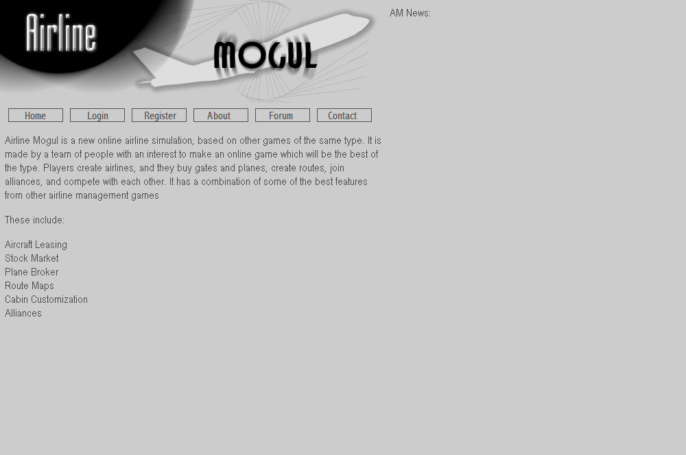The first version was a slow start, working through the user area, gates, aircraft and create route. The first ever website design was actually a black and grey one, with a totally different logo. But when a new logo was submitted a new concept with a white website was created. Initially there was a small community involved in Airline Mogul, totaling around 75 players. Login and Registration opened for the first round on Christmas Eve (December 24th) 2005. From there Airline Mogul continued with a variant of the current website design to add new features such as aircraft leasing, something that wasn't too common in the games of the time (Project AirWave and ClearSkies were some of them).