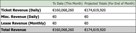 Also, the left and right columns show different data. On the left, you'll find your daily income and costs, such as ticket prices and staff expense, to date. This a running total of all revenues and costs accumulated in this month. The right column shows your Projected Totals. This means the amount of money that has gone in or has been spent at the end of the month, providing none of the amounts change.