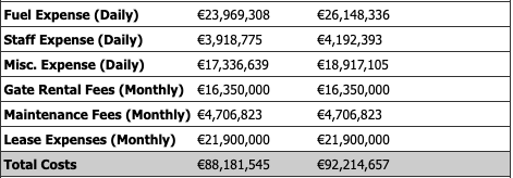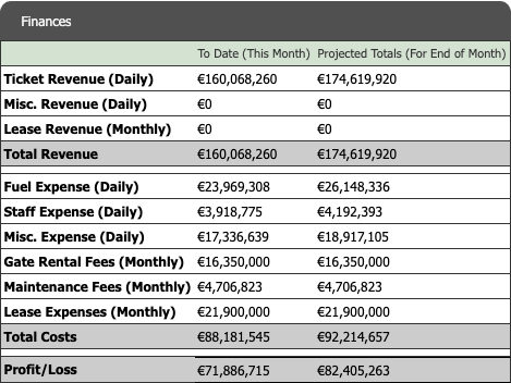 Your costs consist of fuel and staff costs. These costs are paid for each game day and are counted in your DOC. Gate rental, maintenance and leasing fees are paid for at the end of the month.