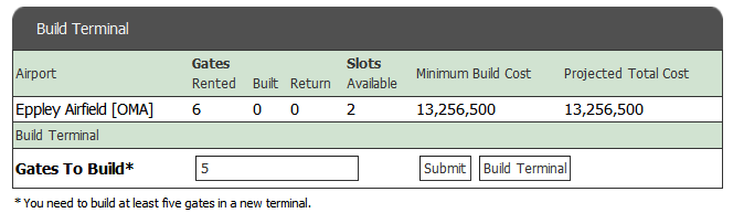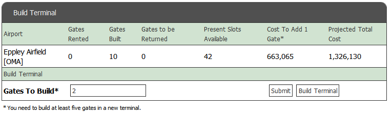 You can adjust the number of terminal gates you want to build by using the Gates to Build text field; however, remember that a minimum of 5 must be built in a new terminal. If you adjust the number of gates to be built, you can click on Submit to see how much it will cost. Once satisfied with your selections, click on Build Terminal.