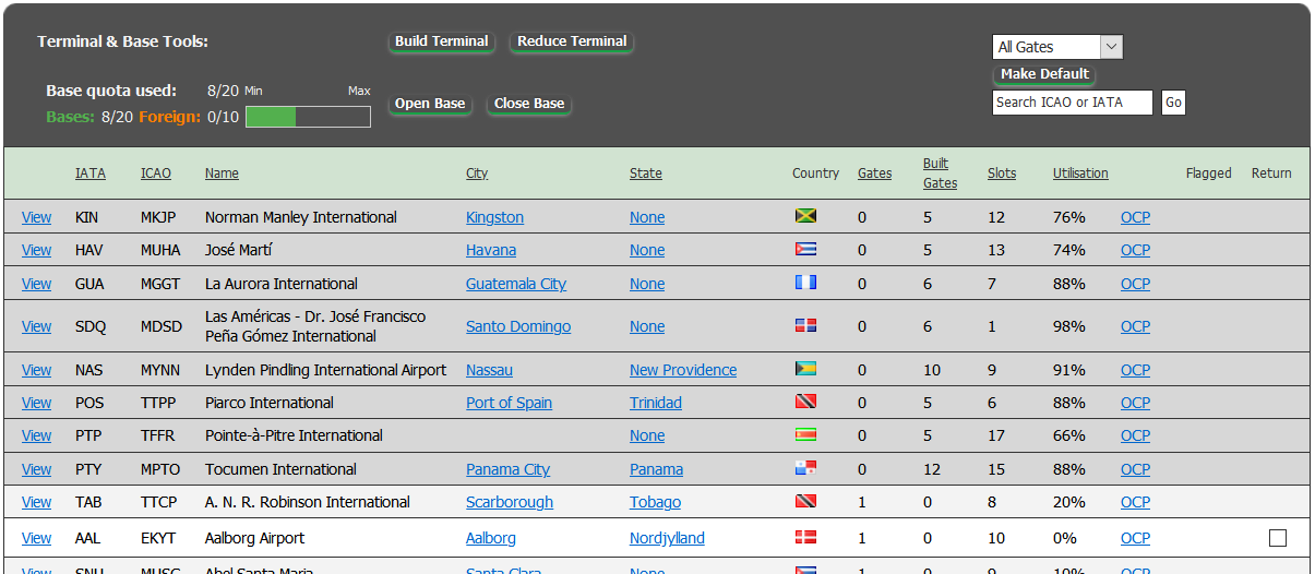 The 'View Gates' page will give you an overview of all the gates you have currently rented, and also the amount of slots available at the airport. To go to the 'View Gates' page, navigate to Operations and click View Gates.