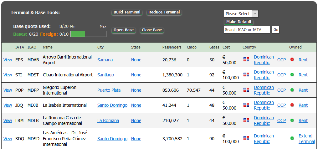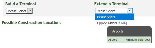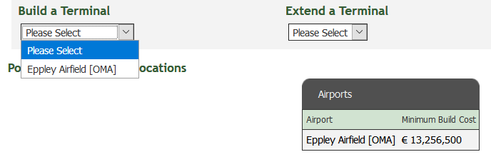 If you wish to add additional terminal gates, terminals can be extended by clicking on the Build Terminal link under the Operations menu or via the link from the View Gates page. By selecting an airport from the Extend a Terminal drop-down menu, you will be redirected to the build page for that airport.